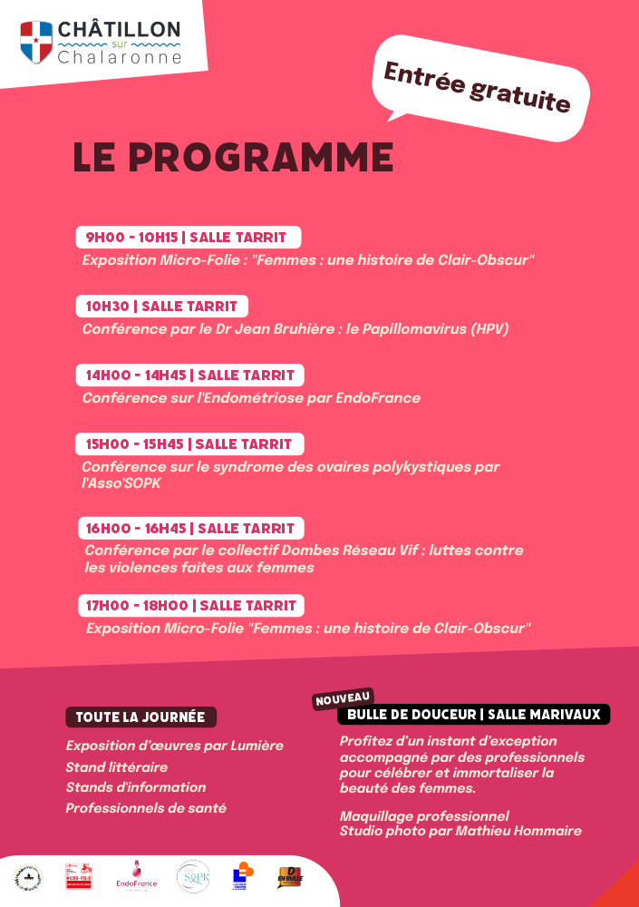 Exposition, conférences, rencontres avec des professionnels de santé et des associations spécialisées, maquillage professionnel, studio photo, espace littéraire.